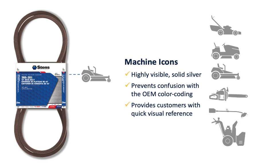 Narrowing the customer’s search and delivering the correct part quickly continues to be a challenge for replacement parts at the retail level. Even with smartphones, retail employees do not have the knowledge or resources to support customers with the same confidence as a dealer. Looking to reduce guessing, we include the top fit-up with brand color callouts on the front of each package and complete fit-up on the back. Each package also includes the machine icon to help customers differentiate between parts meant for walk behind, riding, or zero-turn mowers.